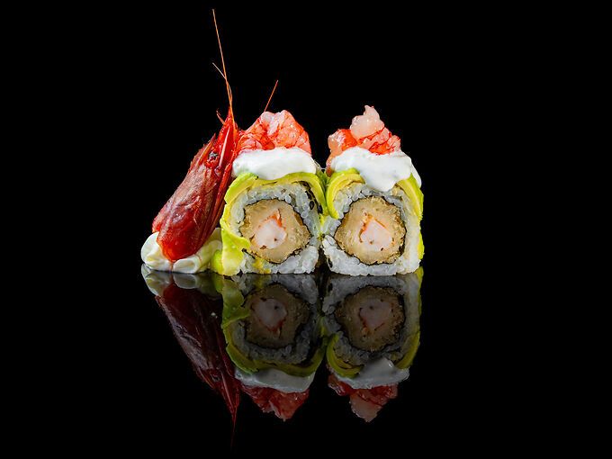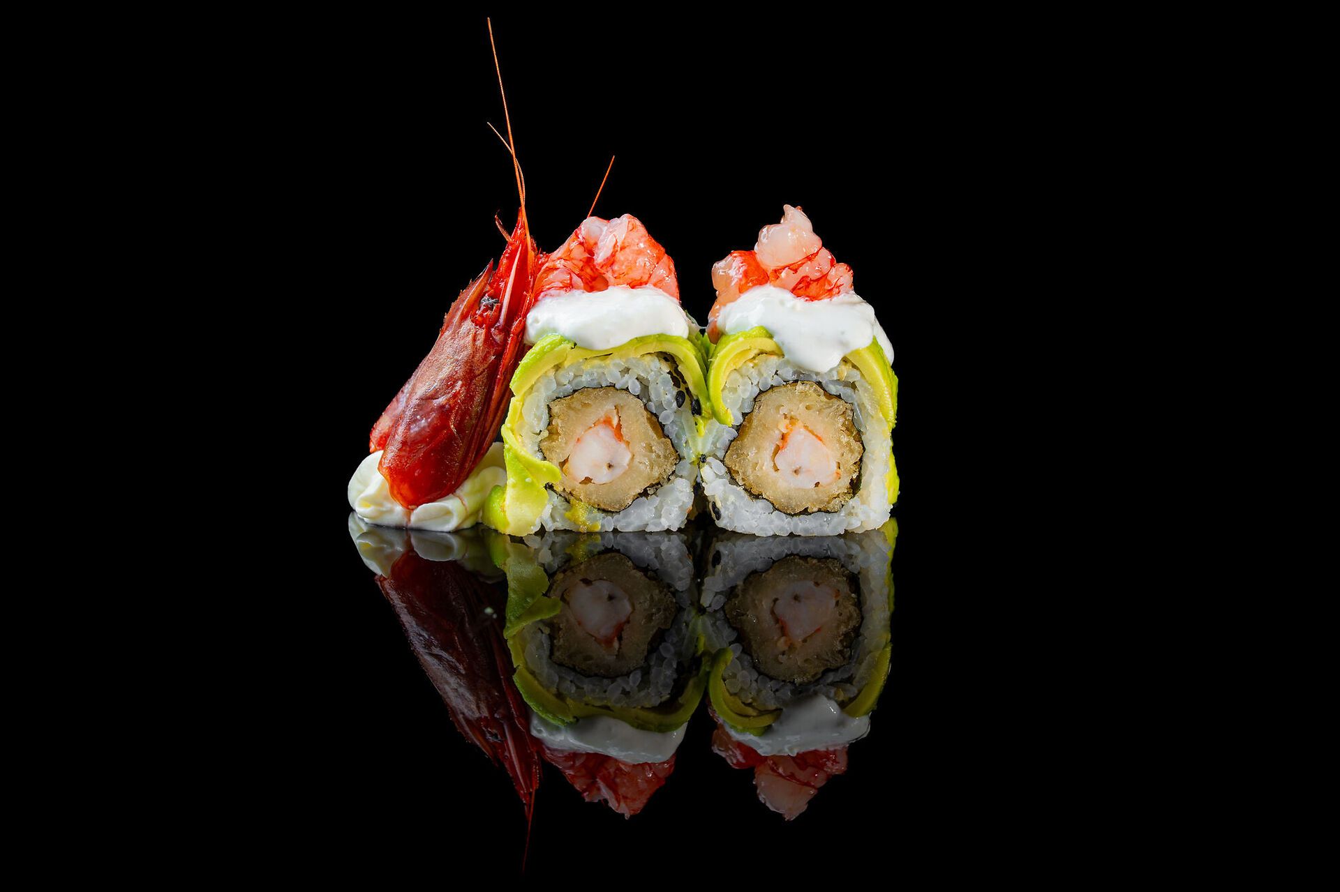 Gamberi rossi, tempura di gamberi, stracciatella avocado