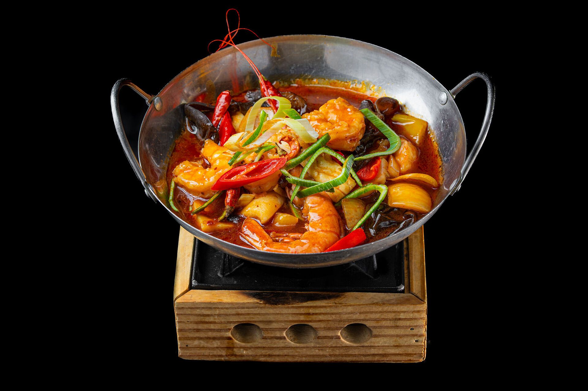 Gamberi, mazzancolle, calamari, funghi cinesi, verdure e peperoncino