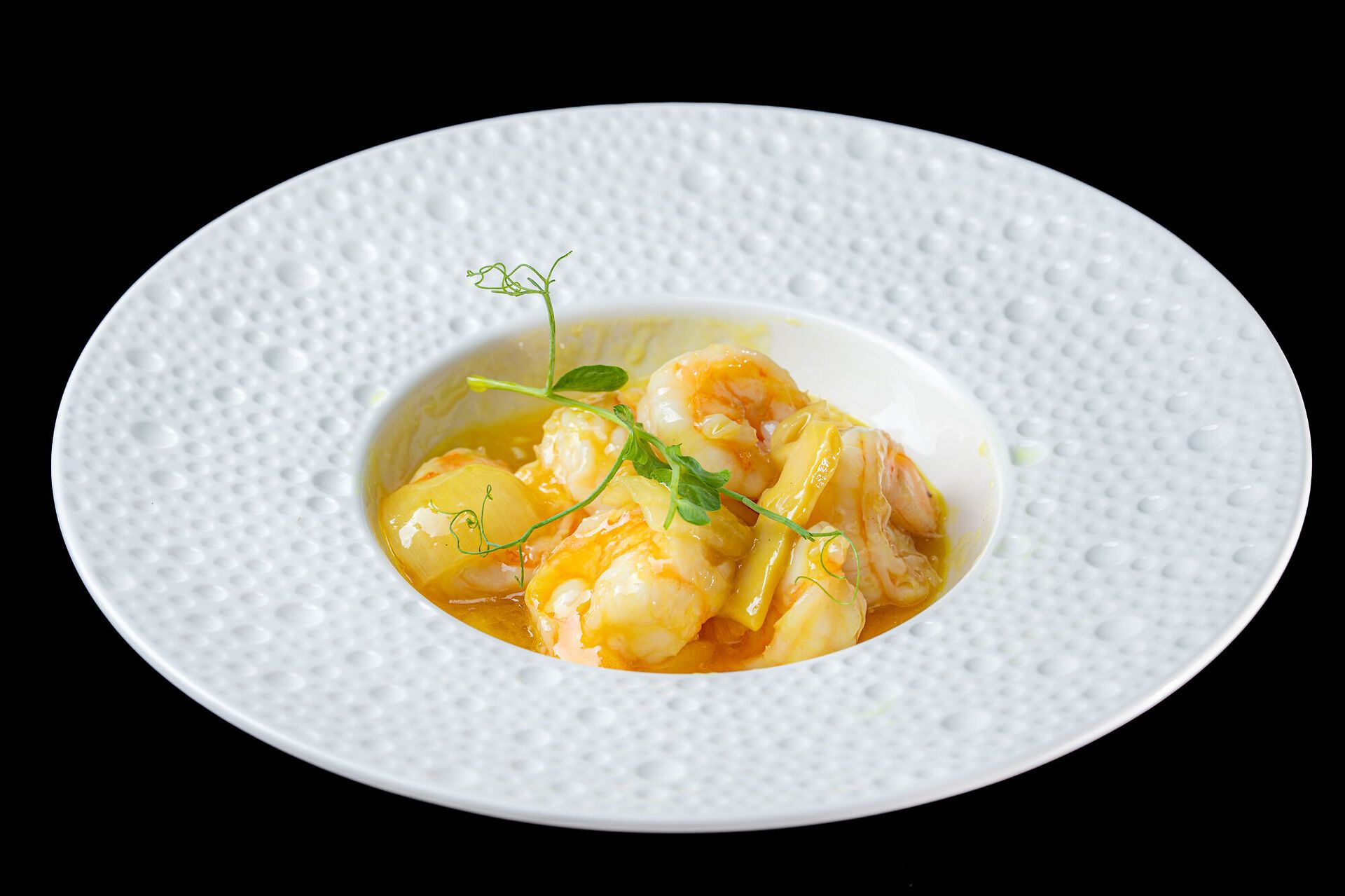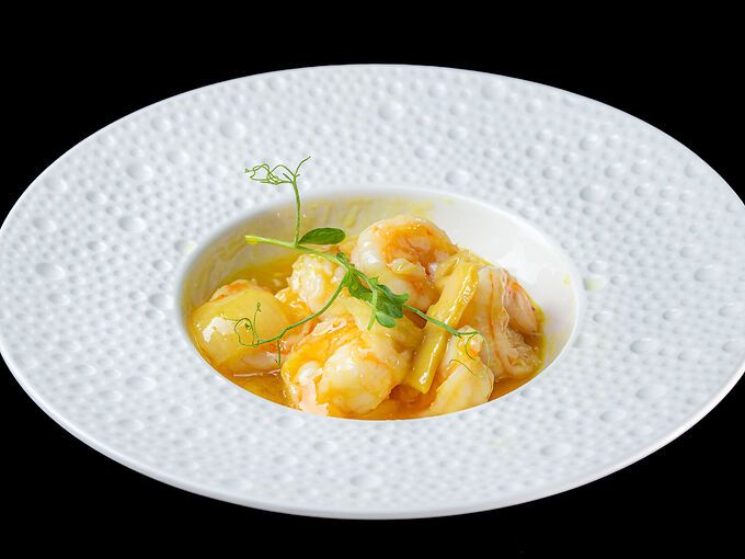 Gamberi (mazzancolle) con cipolla, banbù, curry.