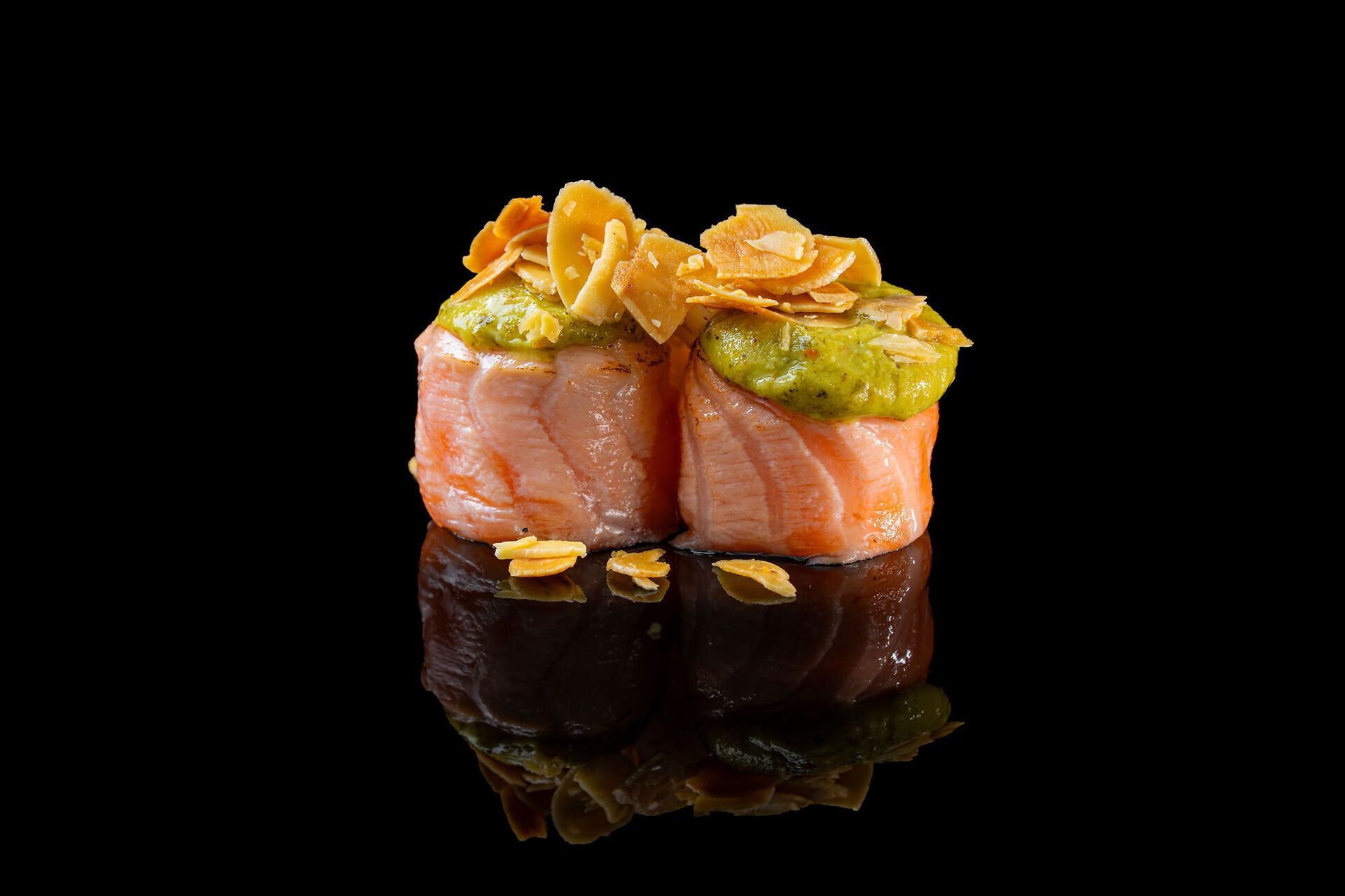 Riso, salmone scottato, pesto e mandorle