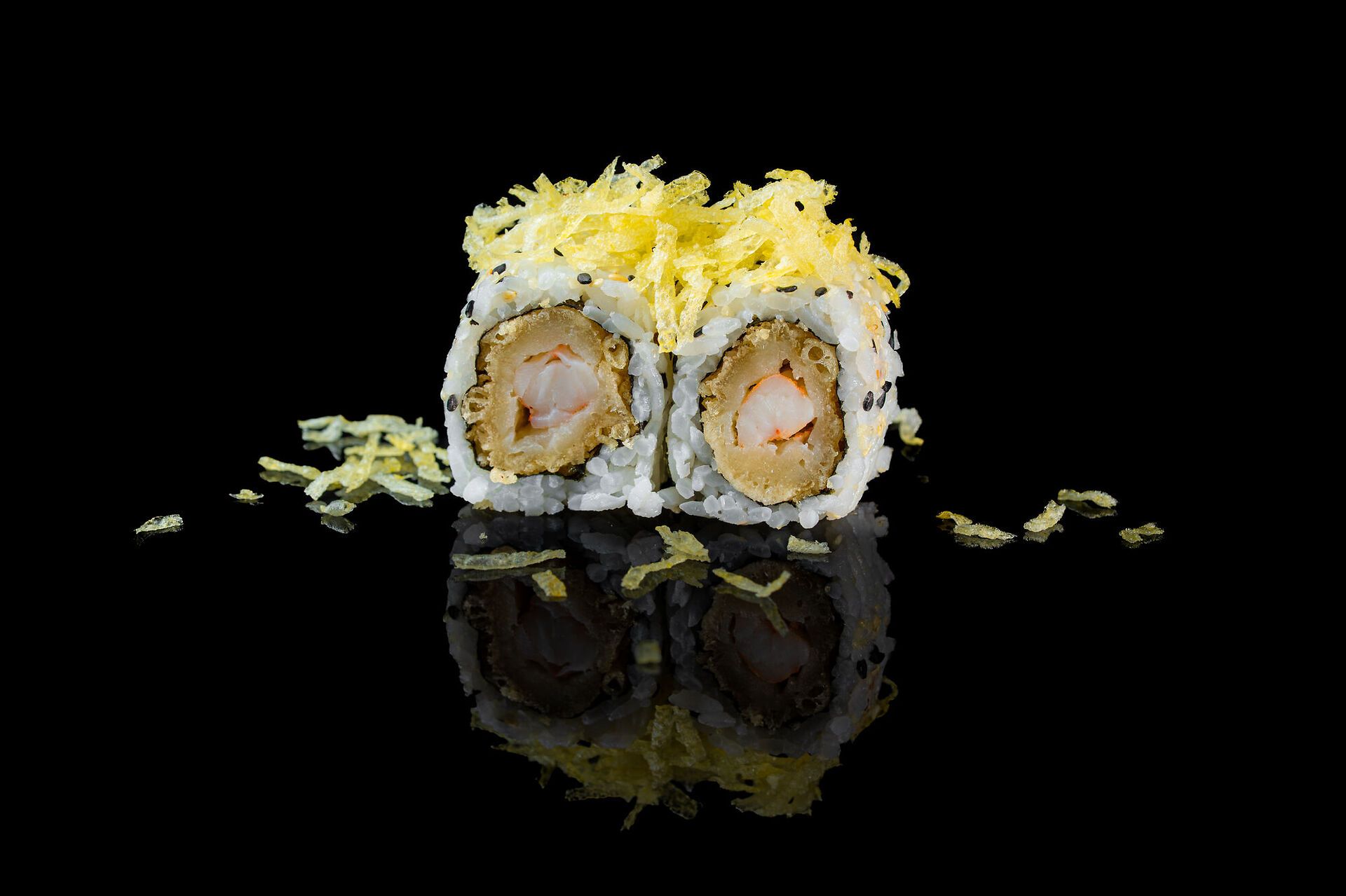 Gamberi in tempura, patate fritte, sesamo e salsa Teriyaki