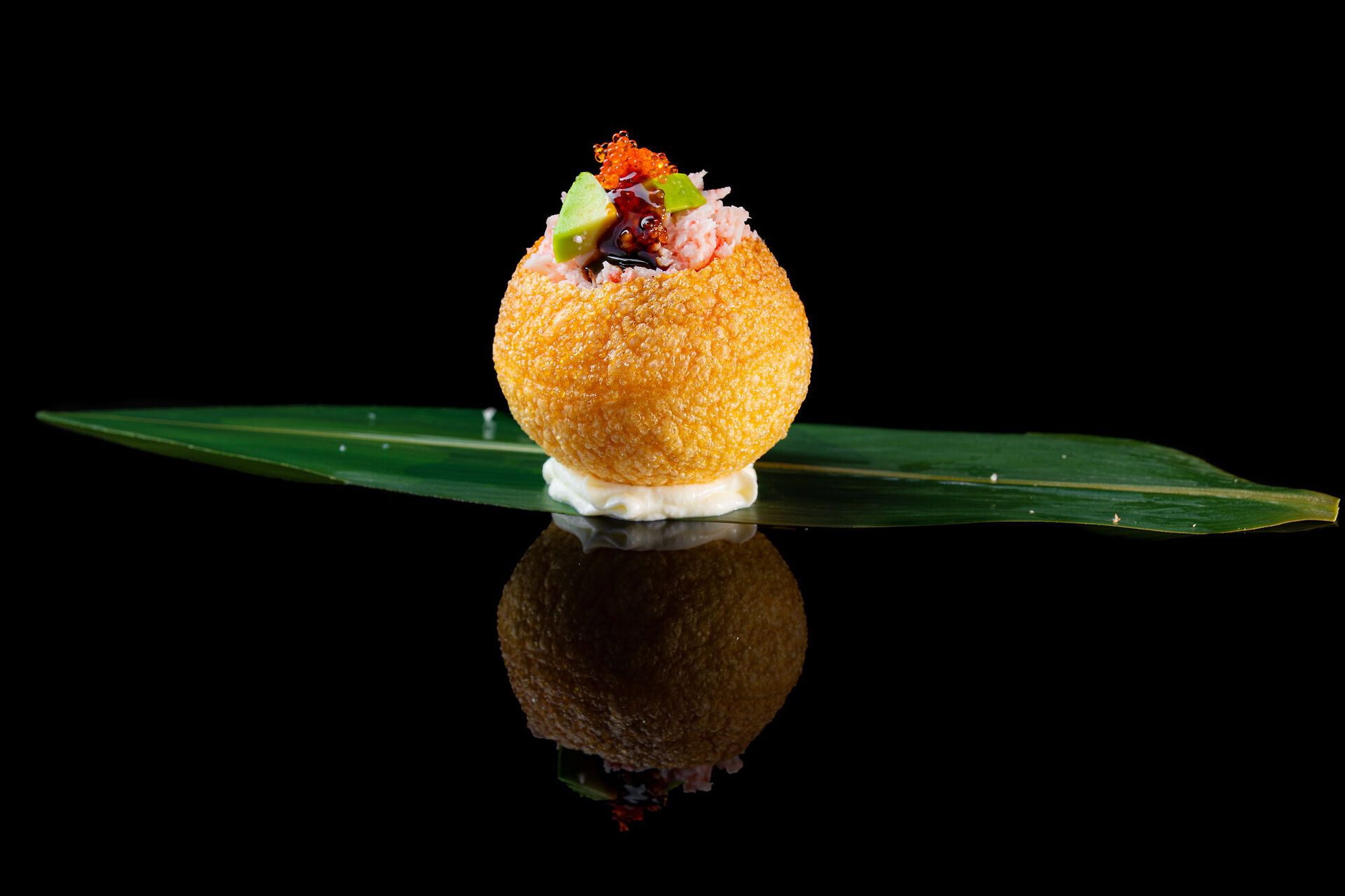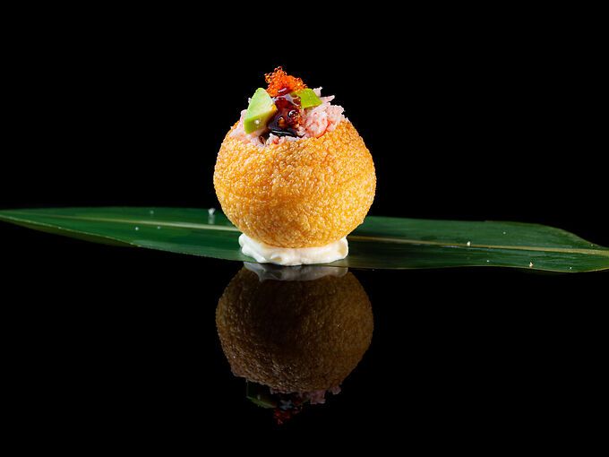 Sfere croccante indiane, granchio di surimi, avocado, tobiko e salsa teriyaki