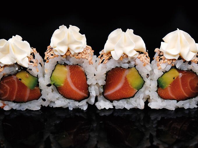 Riso, salmone crudo, avocado, philadelphia e sesamo