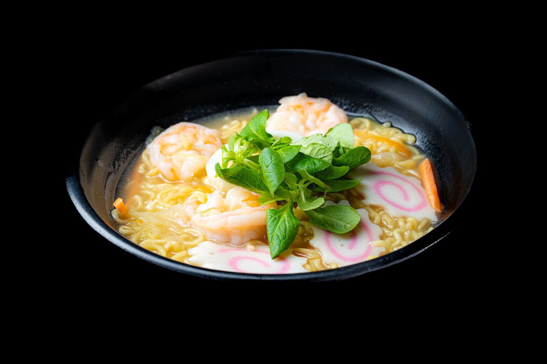 Noodles in brodo con gamberi, surimi di granchio, uova e verdure miste