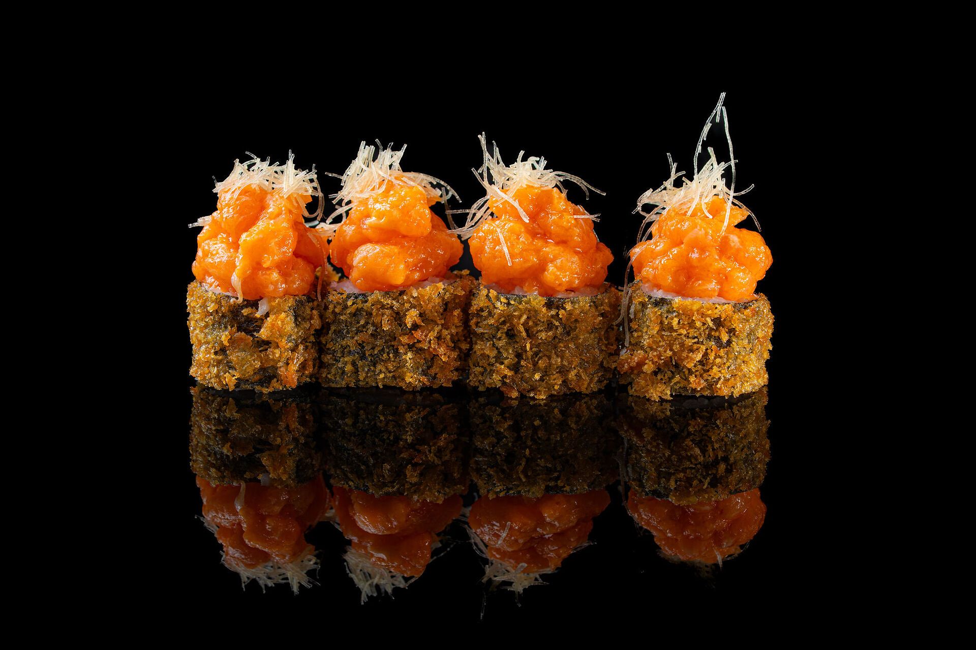 Salmone, tartare di salmone e salsa maio spicy, pangrattato e kataifi